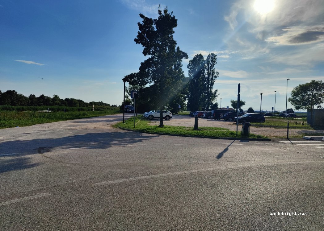 In effetti il parcheggio è precluso alle altezze maggiori di 2 metri, ma vi sono altre occasioni nei paraggi, a iniziare dal gran piazzale della chiesa oppure del vicino ristorante. Opportunità di far acqua alla fontanella, ma ***** 5 stelle alla pista ciclopedonale di una decina di km ai margini della laguna, che arriva Portegrandi (inizia a destra dopo aver passato il ponte di barche). Panorami mozzafiato