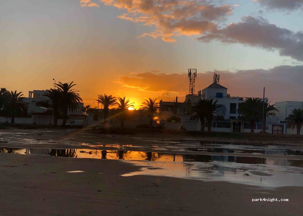 Grand parking sablonneux sur la plage, en partie jonché de détritus sur le parking, plage assez propre, quand il pleut des flaques d'eau se forment parfois (mais peuvent être évitées), il y a des bars pour se promener, bonne solution pour une nuit avant ou après le ferry, très calme
