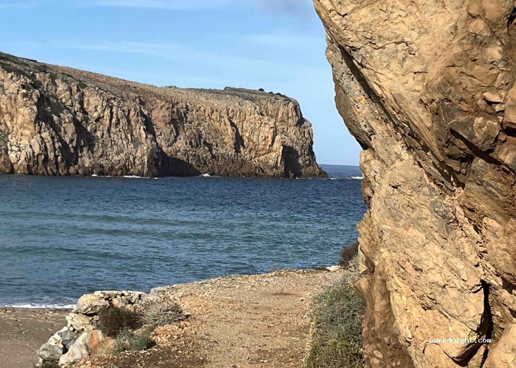 parcheggio ampio su terra senza ombra a 15€ ogni 24 ore. Le due spiagge sono molto belle ed anche la breve escursione per andare alla torre sull'altipiano. Scarico della cassetta WC e carico acqua. No acque grigie. Bar al parcheggio con doccia e bagno ad 1€ ciascuno. Bar anche in spiaggia. Notte molto tranquilla con cielo stellato