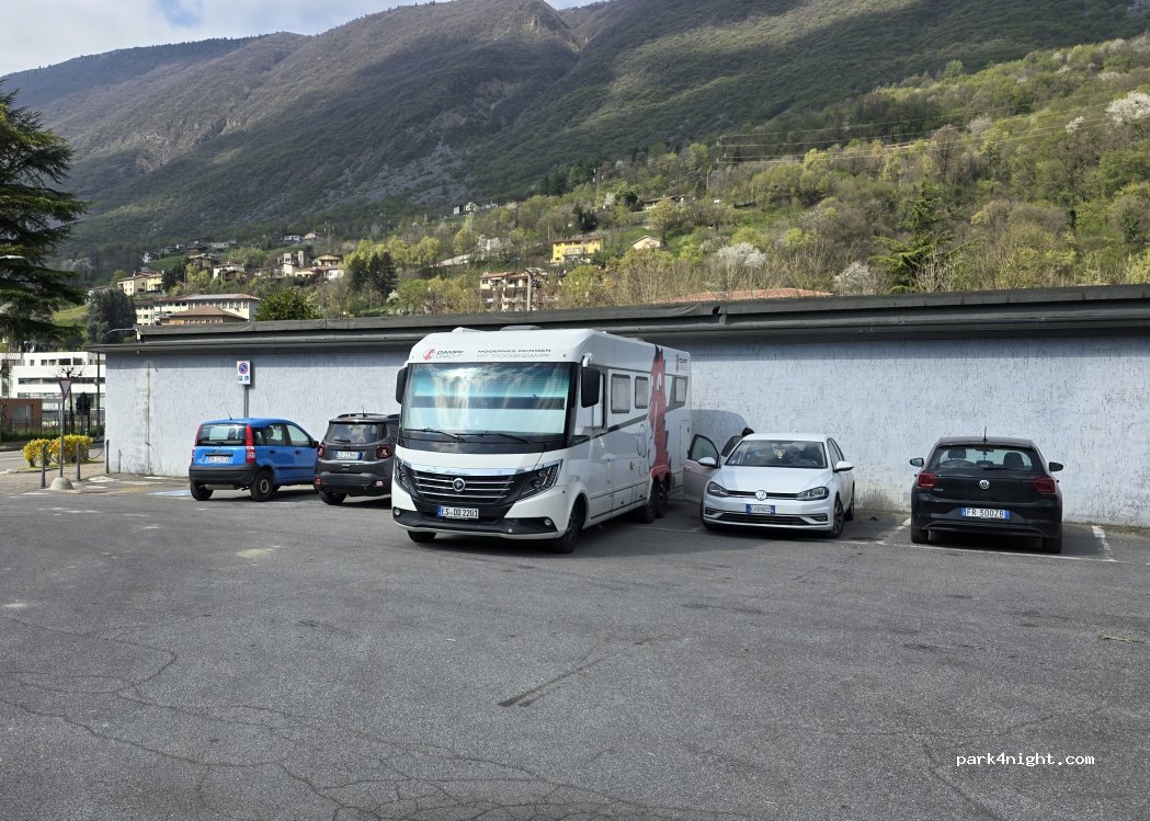 Good spot, quiet, with water and a park with games for kids. We spent a night without any problem. No shadow, no view of the lake, good view on the surrounding mountains.