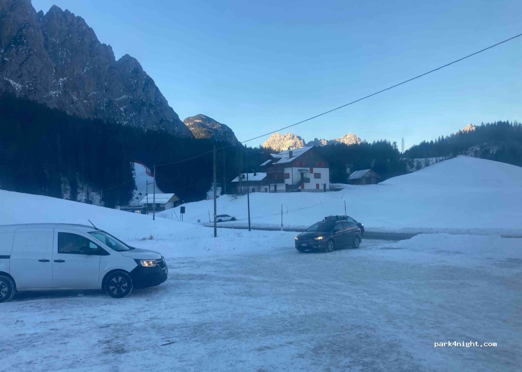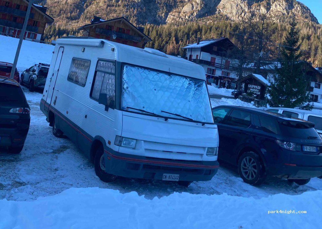 Quiet parking without services, where you can spend the night undisturbed, during the day it fills up with cars as from here there are countless departures for skiing, many and beautiful excursions with every degree of difficulty five minutes from the parking lot, 300 m away you can refill water from a fountain in the village and 4 km away there is the possibility of discharging grey water.