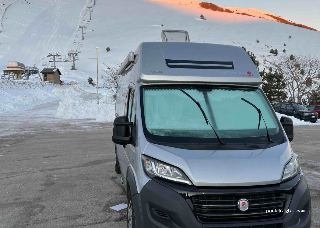 Parking du complexe skiable de la commune de Pescocostanzo. Il y a environ trois remontées mécaniques. Parking fréquenté pendant la journée par ceux qui utilisent les services (restaurants et hôtels). Je recommande un excellent point de location de matériel de ski. Arrêtez-vous sur un endroit plat et calme à un kilomètre de la ville.