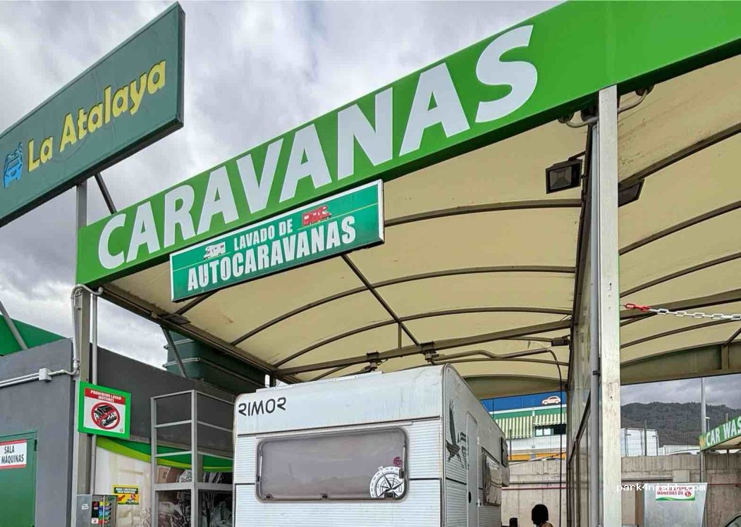 Estación de lavado de coches junto a una gasolinera. Conexión de manguera para llenar con agua limpia. Se recomienda solo como último recurso, ya que es caro llenar el depósito aquí.