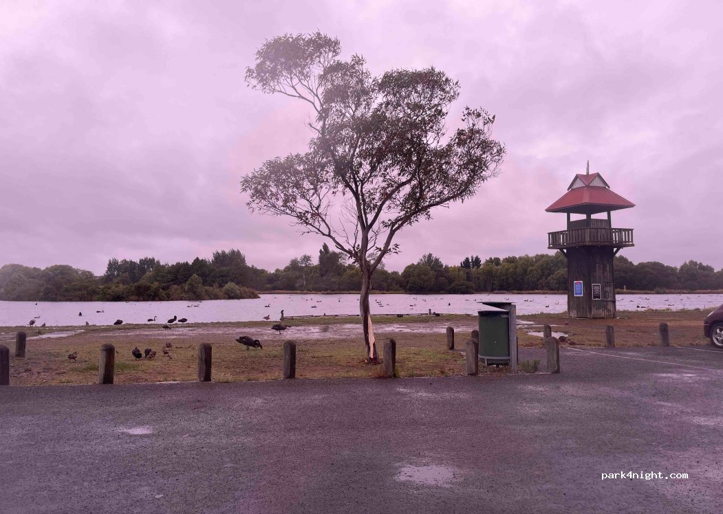 Large car park with no limit on spaces where overnight parking is possible. No parking or manoeuvring difficulties. Toilets nearby which open between 7am and 7pm in the summer. There is also a hot shower available during these same hours. Near a lake but swimming is not recommended due to algae.