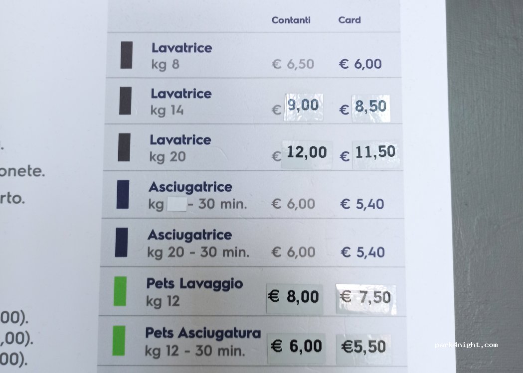 6.50€/8kg 12€/20kg washer 6€/30min dryer