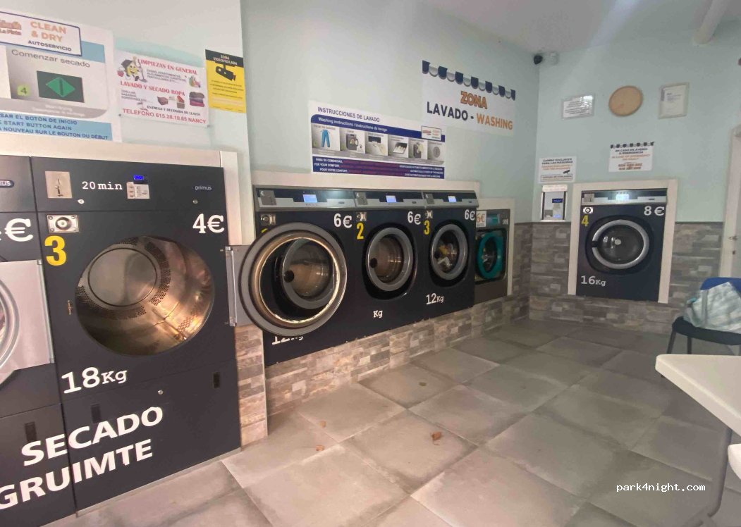 Self service laundry. All coin operated, with a machine to change notes to coins. Chairs for waiting.