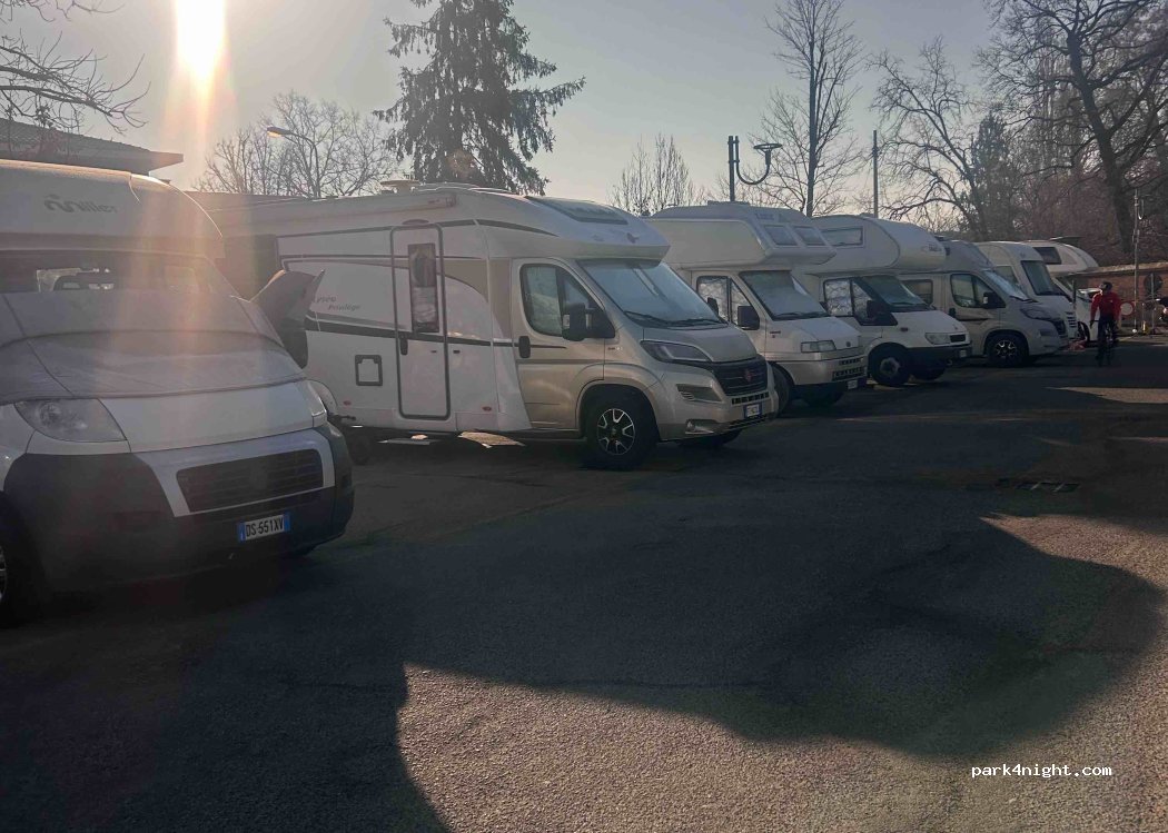 À 30 min de Turin. Grand parking .aucune interdiction. Eclairé. Petit robinet eau devant l’entrée du stade. Poubelles.calme