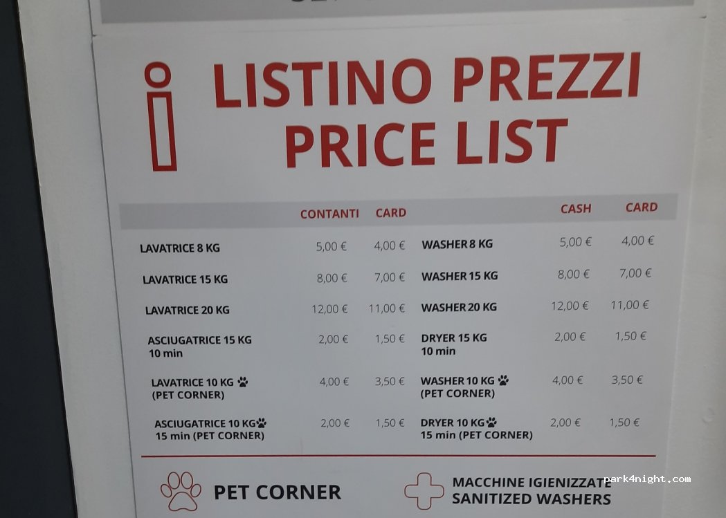 8 kg/5 euro 20 kg/12€ washing 15kg/10min/2€ dryer