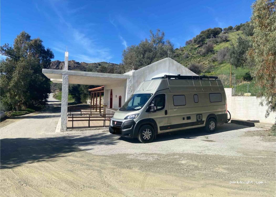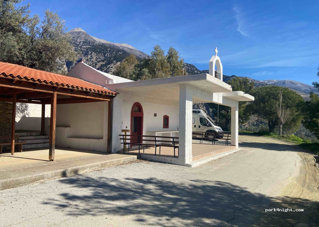 Parkplatz neben einer Kirche. Zufahrt über asphaltierte Strasse. Der Wasserhahn verfügt über ein Gewinde. Man kann nahe davor parken. Es hat Tische und Bänke um hier auch zu Essen. Es sind zwei grosse Grillstellen vorhanden. Hier werden Feiern abgehalten. Toilette leider verschlossen.