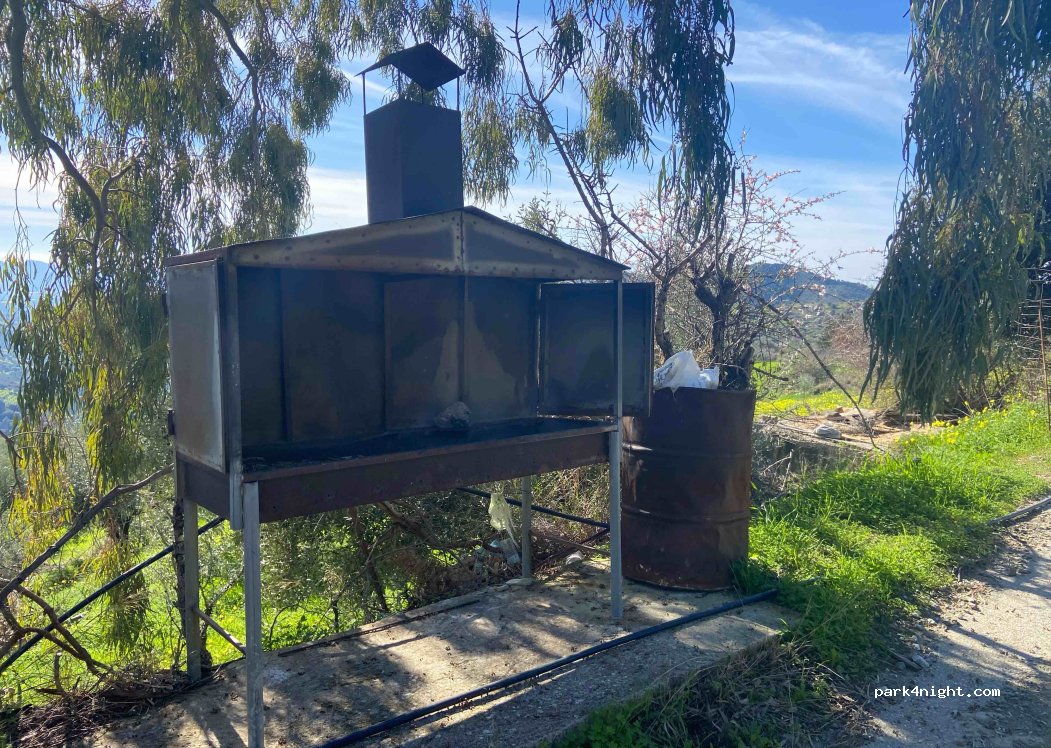 Parking lot next to a church. Access via asphalt road. The water tap has a thread. You can park close to it. There are tables and benches where you can eat. There are two large barbecue areas. Parties are held here. Unfortunately the toilet is locked.