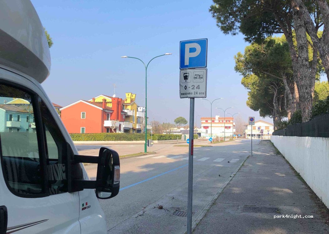 Parcheggio lungo una strada laterale, vicino al mare, massimo 24 ore con parchimetro a pagamento nel periodo estivo. Posto per 2-3 Camper