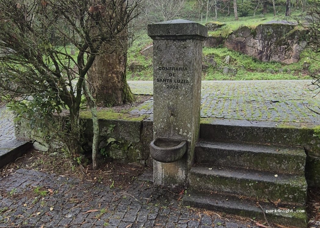 Water point on the side of the road. Between the parking spaces and the stone tables.