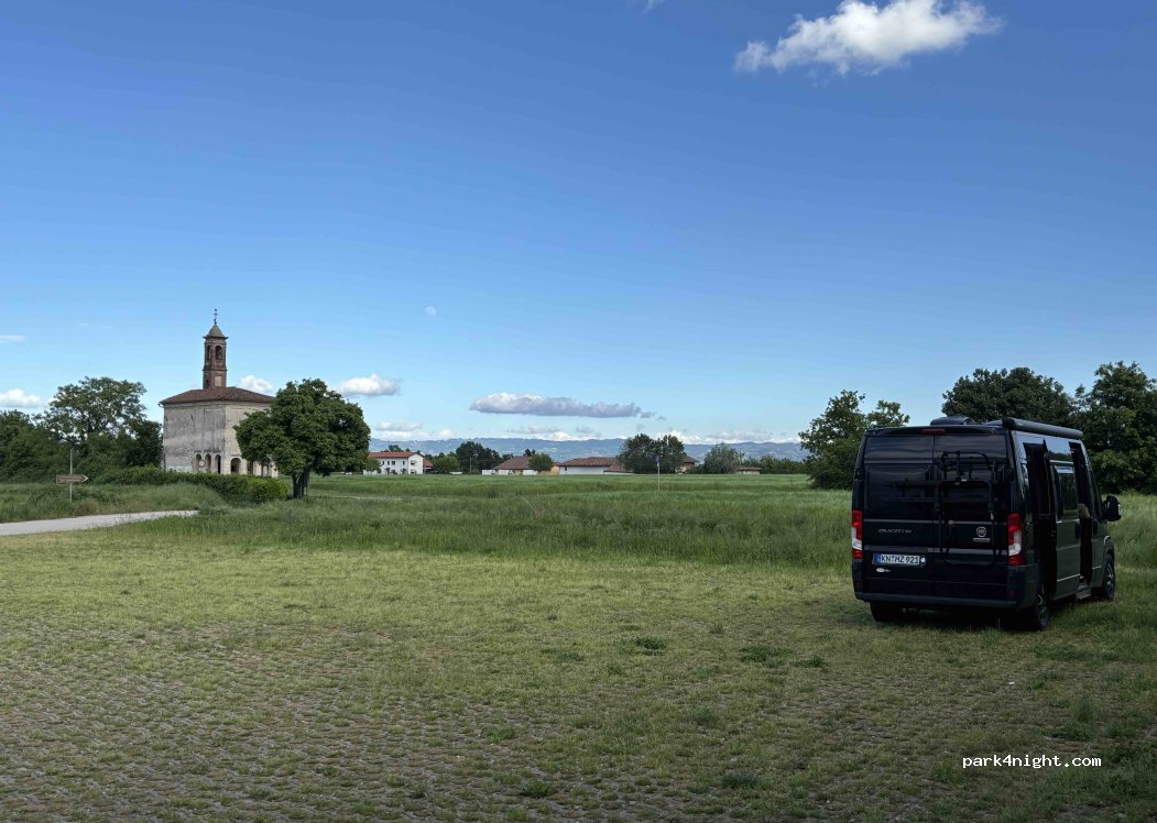 Parkplatz Augusta Bagiennorum Naturale Riserva. Parken in einer ruhigen Gegend, ideal für den Besuch der archäologischen Stätte von Augusta Bagiennorum (alte römische Stadt) und als Ausgangspunkt für Radtouren. Wir waren für 2 Nächte dort ohne Probleme. Kein Service, nur hölzerner Picknicktisch und ein Brunnen.