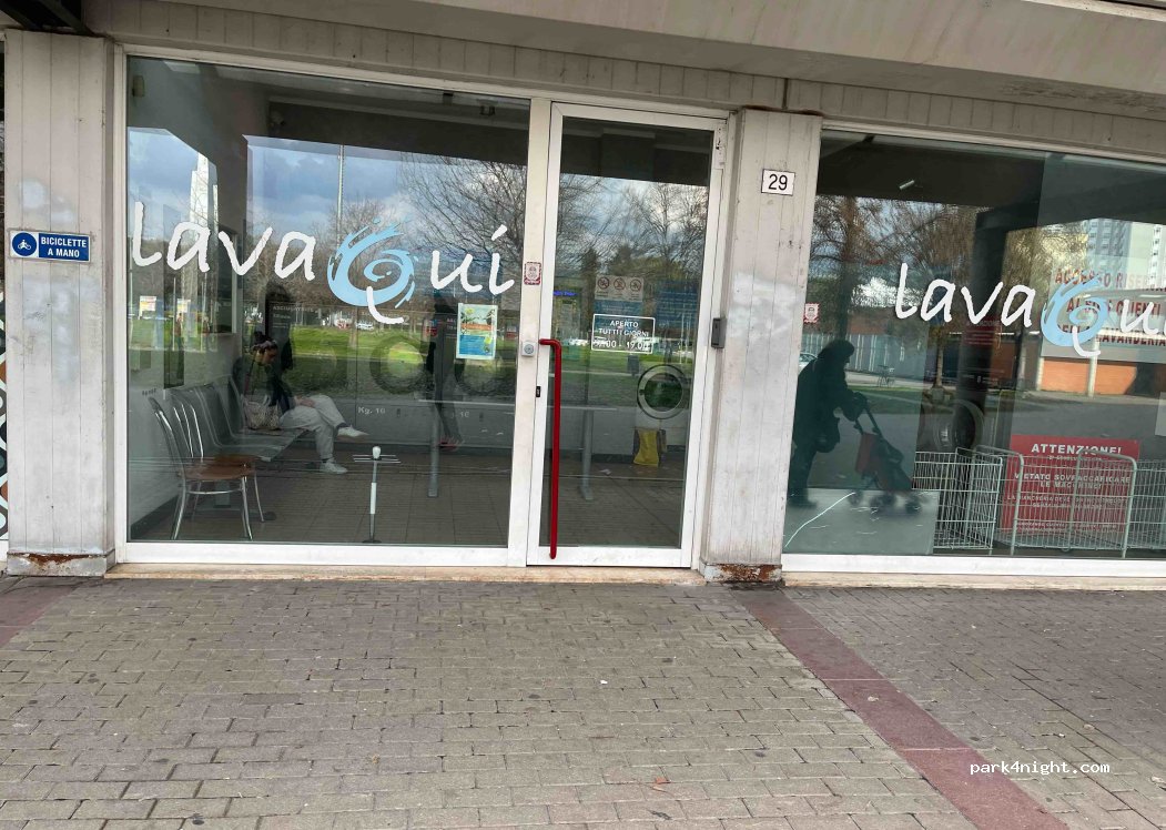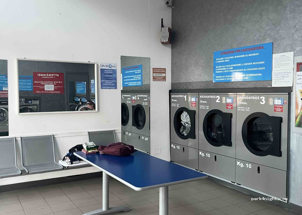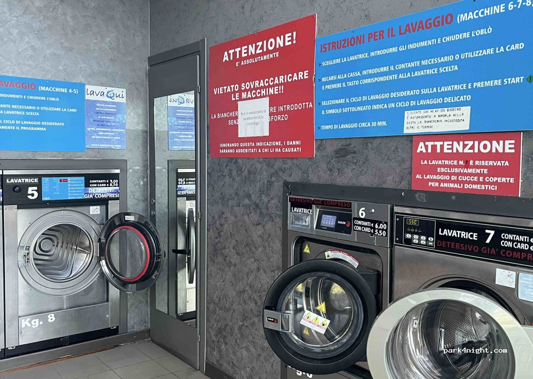 Großer Parkplatz in der Nähe, im Eiscafé nebenan kann man auf die Toilette gehen, wenn man nachfragt. 8 kg-45 min-9 Euro, 6 kg-6 Euro. Trockner 30 min für 5,50 Euro. Es gibt WLAN und Strom und es ist recht sauber