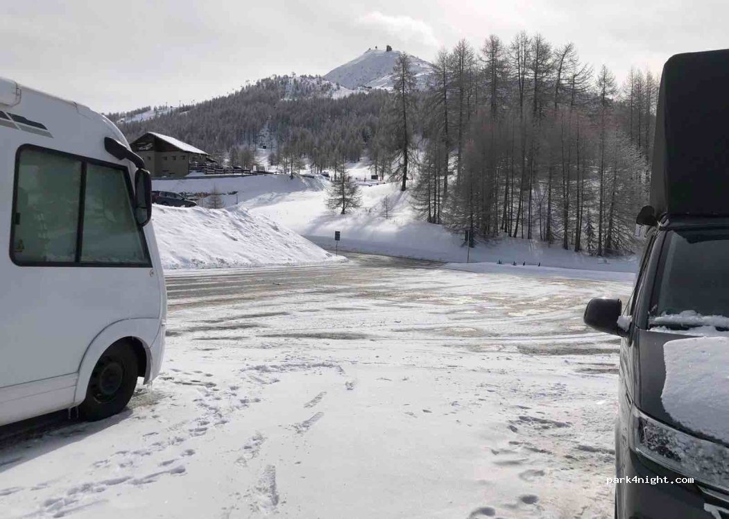Perfetto parcheggio solo per camper non c'è carico e scarico ma e tranquillissimo con vista sulla vallata il centro Sestriere e vicino un po' in salita ma si fa.a 500 metri negozio con pane e alimentari