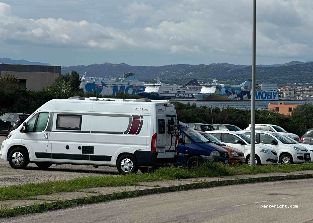 Parcheggio di fronte tecnomat, con vista sul porto. Nessun divieto per camper ed è vicino all’ingresso del pozzo sacro sa testa