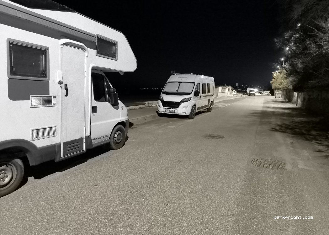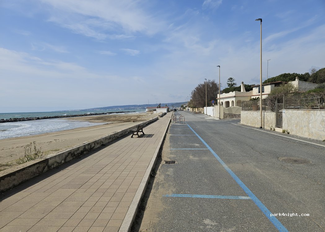 Keine Camperverbotsschilder, ruhige Straße zum Übernachten, Direkt am Strand mit Blick auf das Castello. Fast alle Bars und Restos geschlossen. Mülleimer vorhanden.