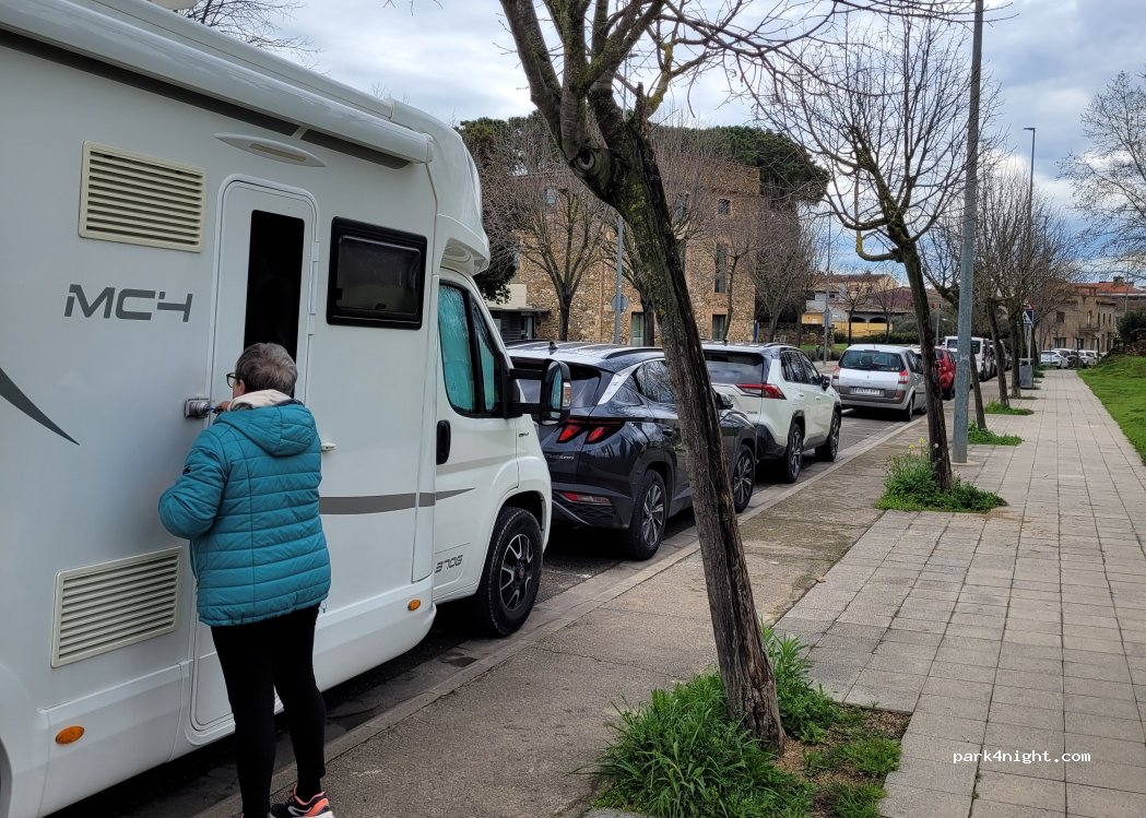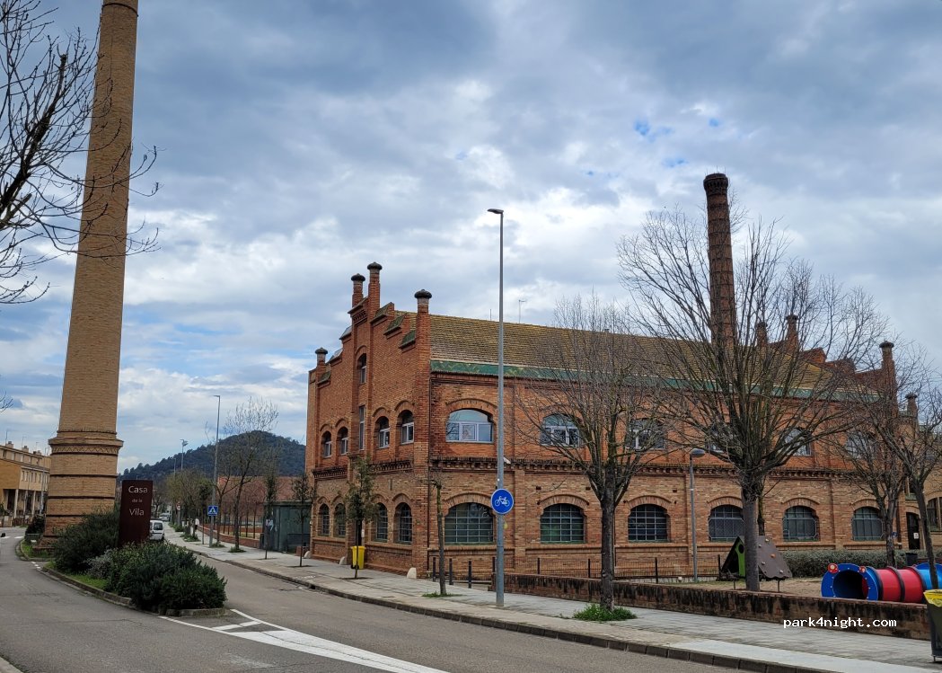 Aparcamiento cercano a la fábrica modernista Pagans, policía local y piscina pública.