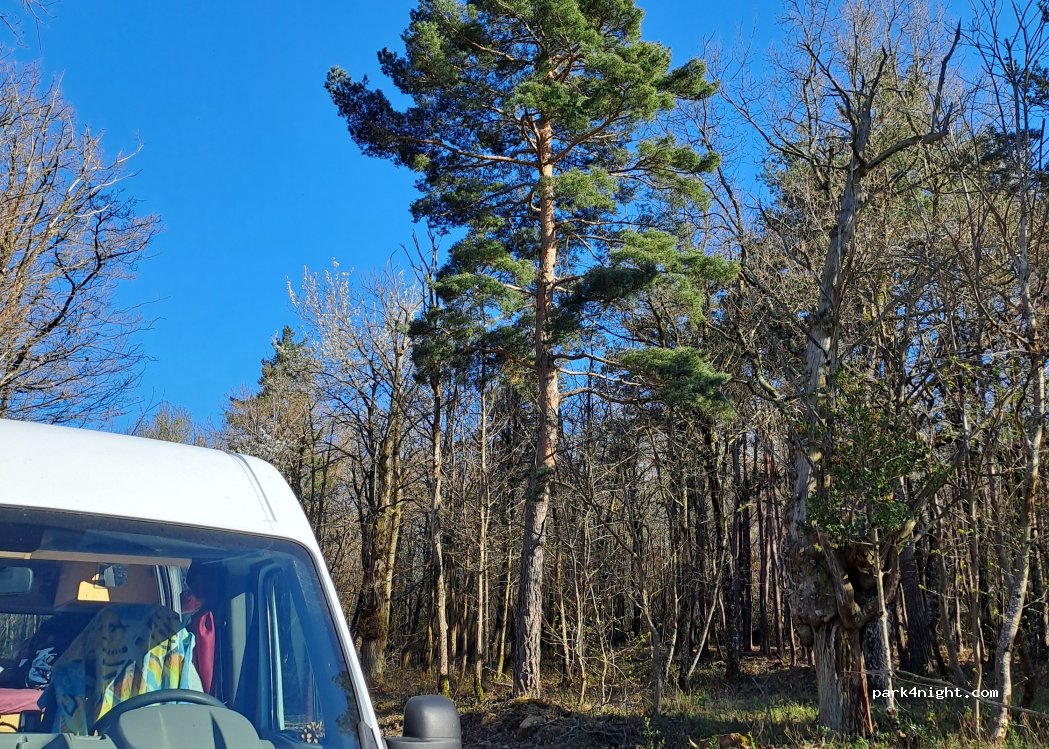 Pas loin des éoliennes dont on entend le murmure,à côté d'un réservoir d'eau, en forêt mais lumineux, route en gravier large. Accès depuis le col de Rotisson. Pas de vue.