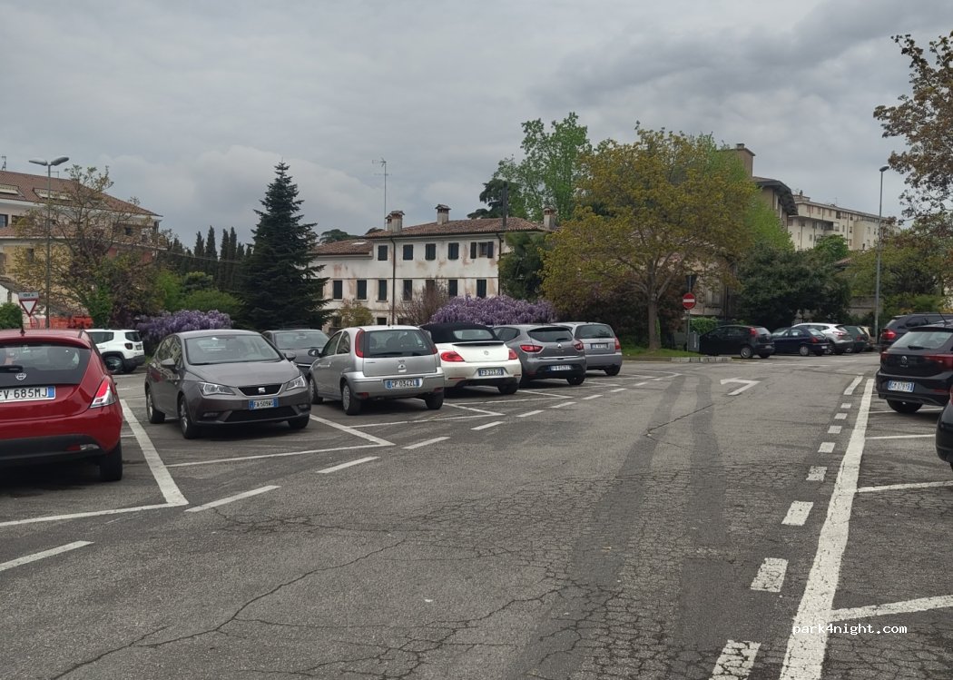 Sconsiglio di parcheggiare qui, è il parcheggio della stazione. Ci sono posti molto più ampi e ugualmente vicini al centro: ad esempio di fronte al camper service, dall'altra parte di via Sansovino, vicino ai Carabinieri, c'è un piazzale enorme.