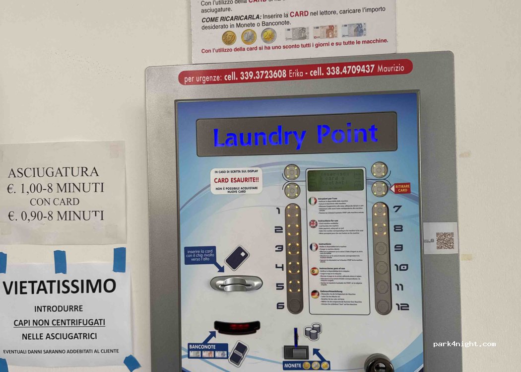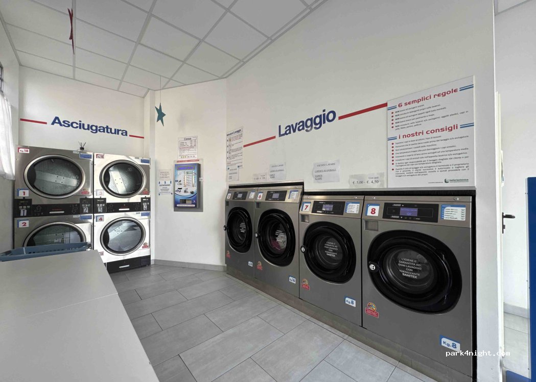 Lavanderia self-service. La macchina accetta monete e banconote fino a 20 euro. Offre il resto. Il bar è proprio accanto :) Aperto tutti i giorni dalle 6:30 alle 22:30.