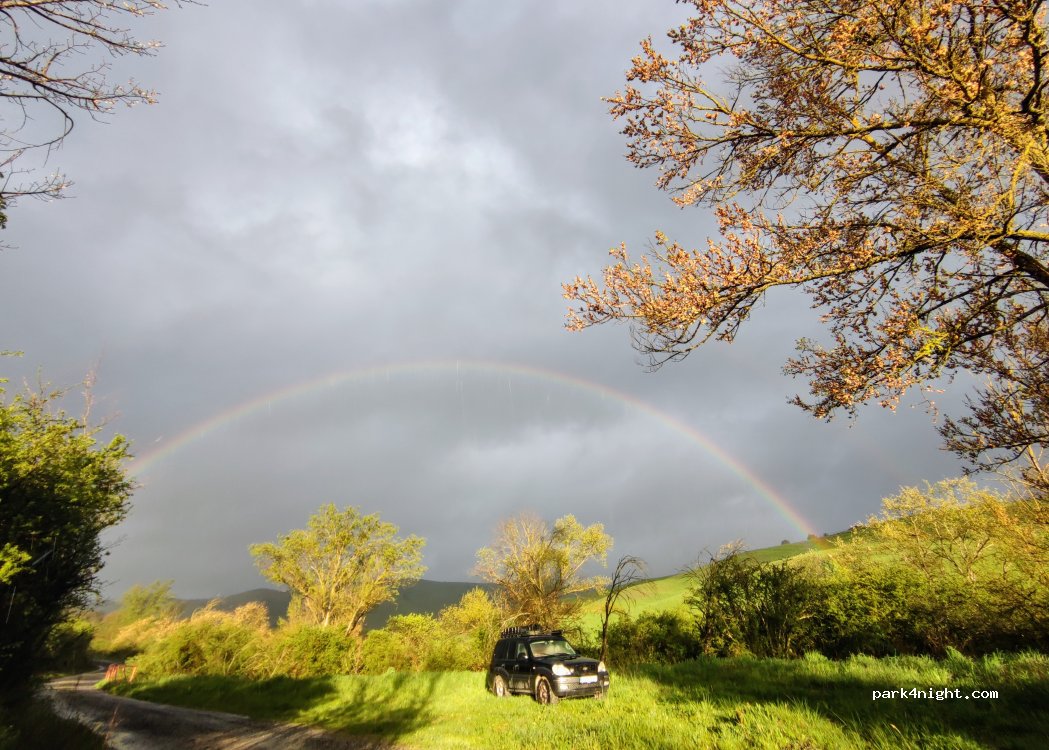 Kleine Wiese an der kleinen, ruhigen Straße, die ins Nirgendwo führt. Abends, nachts und morgens keine Autos. Idealer Übernachtungsort, leicht von der Hauptstraße aus erreichbar.