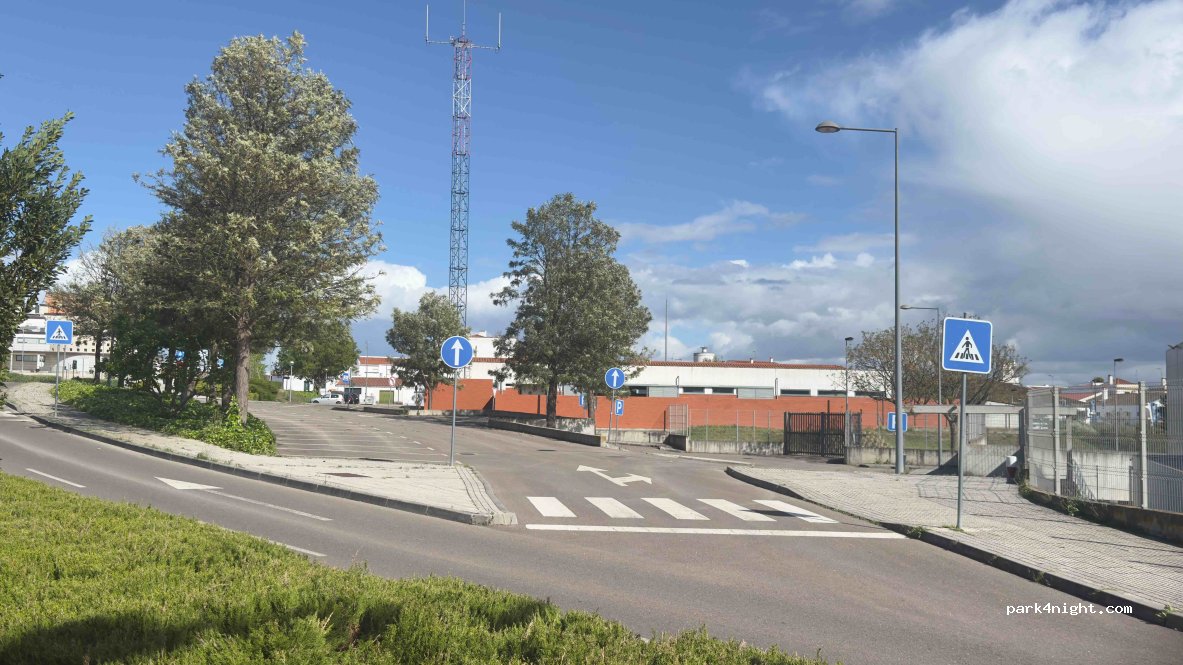 Justo enfrente del otro aparcamiento pero este tiene sombras de arboleda. En la misma acera de la GNR.