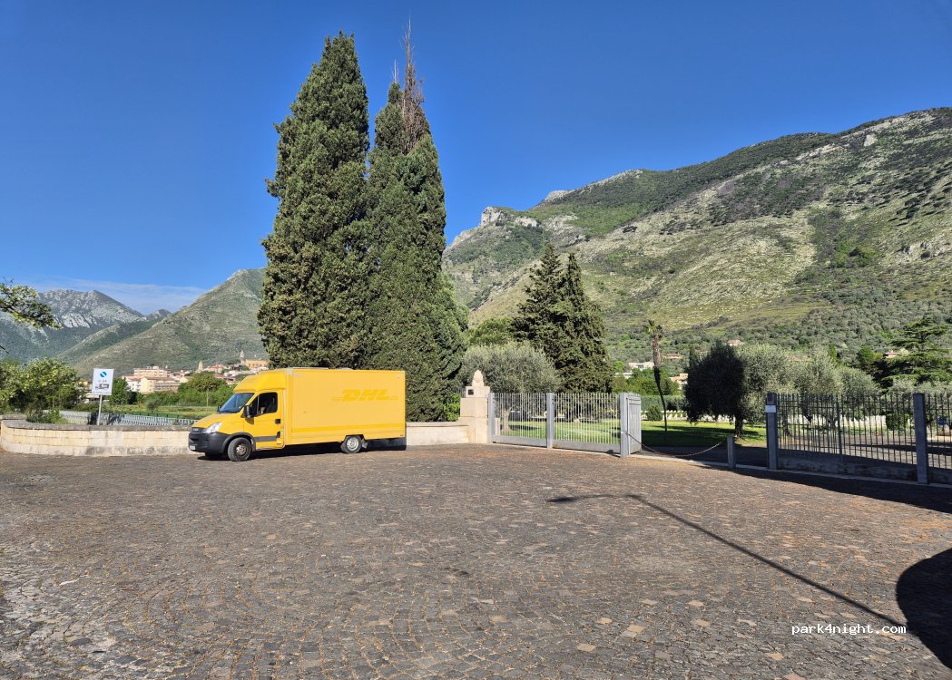 Parcheggio asfaltato e pianeggiante di fronte al cimitero militare. Si trova accanto a una strada trafficata, quindi l'ho classificato solo come parco diurno. Facile da raggiungere, anche per i camper di grandi dimensioni. Divieto di sosta per i veicoli di peso superiore a 6,5 t. Circa A 1 km dal centro storico.