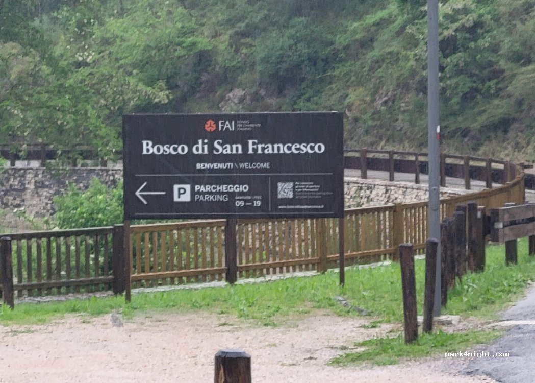 Estacionamiento FAI cerca del Bosco di San Francesco. Desde este aparcamiento se puede llegar a la Basílica en media hora a pie. Hay dos rutas: la primera que pasa por el bosque (ruta de pago) y la segunda que pasa por la carretera (gratuita).