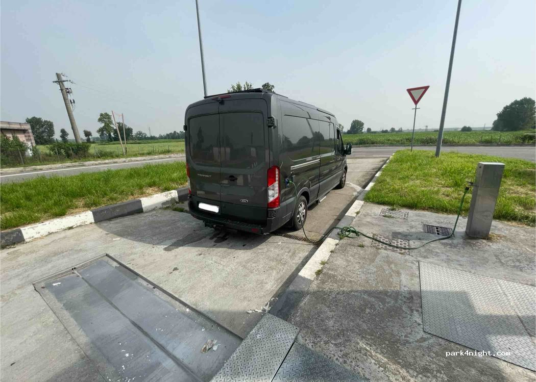 Situé sur une aire de repos a proximité du parking poids lourd. Services facile simple et propre. Lieu tranquille pour vidanger et recharger en eau, nous avons peu prendre une douche manger faire la vaisselle et vidanger et fait le plein d’eau propre à nouveau avant de repartir.