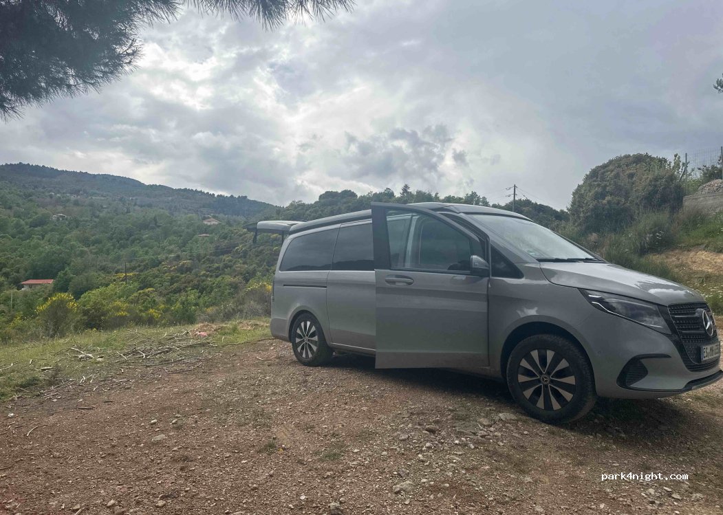 Netter Platz hinter einer Kapelle mit Meerblick. Leicht zugänglich über Schotterweg in der Nähe der Strasse aber etwas versteckt