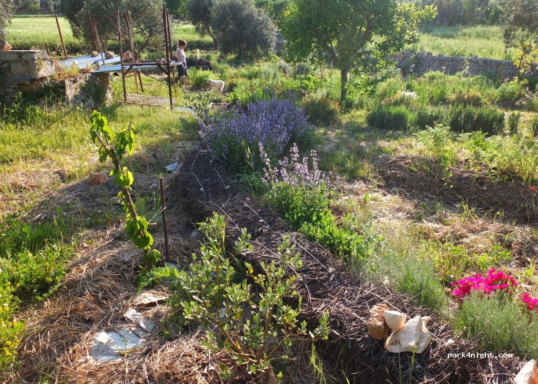 Depuis 2013, nous cultivons un jardin forestier et introduisons des colonies d'abeilles afin de promouvoir la biodiversité et de soutenir l'écosystème local. Nous proposons des visites guidées de notre jardin forestier pour découvrir la flore et la faune qui se sont développées au cours de nos 15 années de présence. Au fil des ans, nous avons planté environ 150 arbres et arbustes fruitiers (abricotiers, nèfles, poiriers, pommiers, kakis, cerisiers, figuiers, azeroles, grenadiers, feijoas, pêchers, noyers, noisetiers, amandiers, vignes, pruniers, amélanchiers du Canada et arbousiers), ainsi que plus de 1 000 plantes aromatiques (principalement romarin, sauge, lavande, origan et thym) et légumineuses (Gleditsia triacanthos, Acacia saligna, Acacia dealbata, genêts et arbre de Judée). Une attention particulière a été portée à la production de pollen et de nectar pour les abeilles. Nous proposons également des séances de tarot et de réflexologie plantaire.