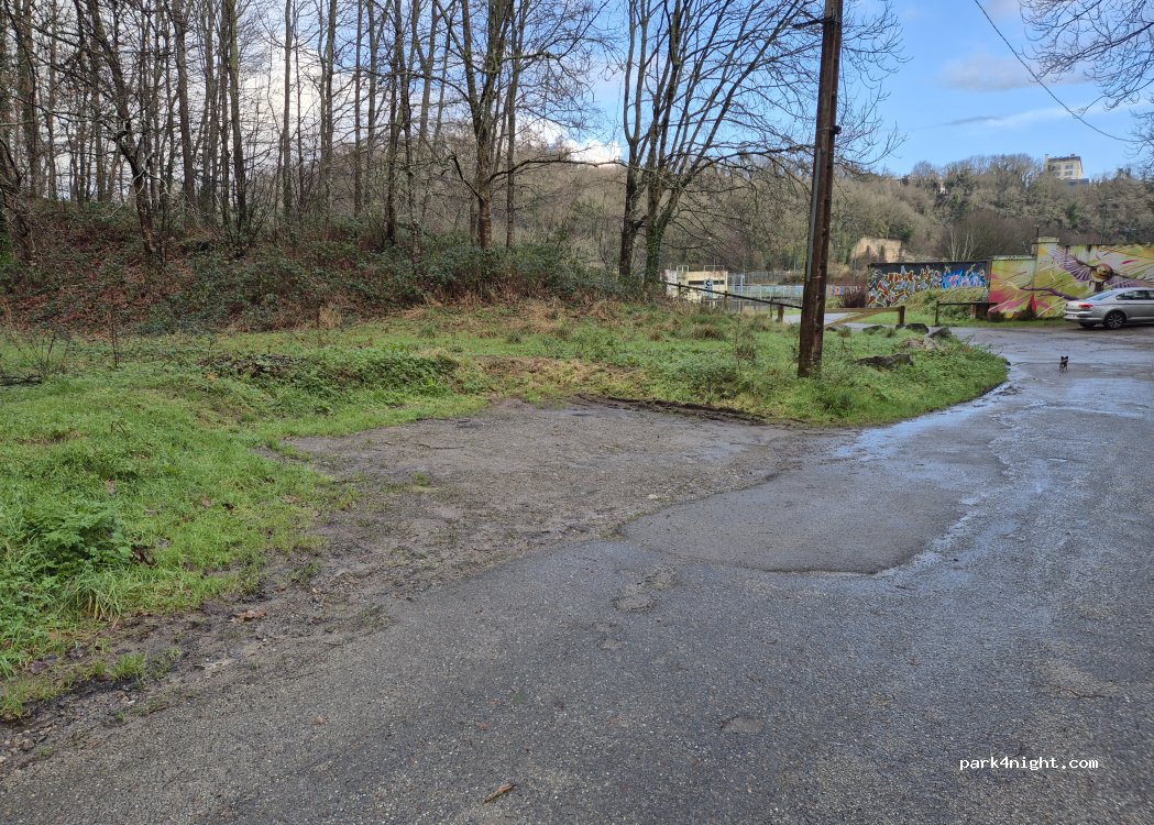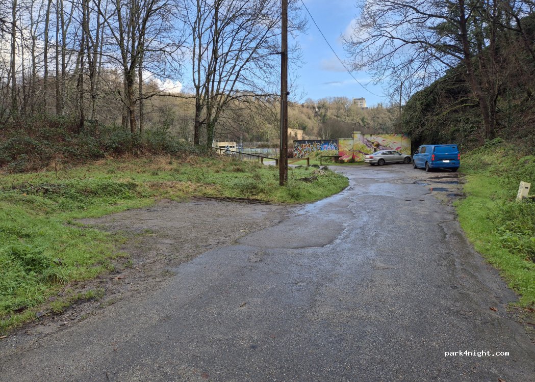 Au bout d'une impasse. Le lampadaire est allumé jusqu'à 1 h du matin, on n'entend pas la route à proximité. Au bord de l'eau. Chemins et sentiers : sportifs de passage le matin. Plusieurs véhicules possibles.