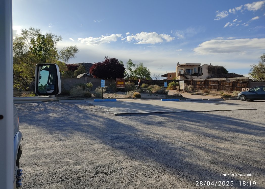 Parken am Anfang der Straße zum Besuch des Piedras Marcadas Canyon, nicht sehr horizontal. Es gibt keine Schilder, die das Parken verbieten. Eine Gegend, in der man sich sicher fühlt, etwas, das man in Albuquerque hervorheben sollte. Nicht geeignet für Wohnmobile mit einer Länge von über 30 Fuß.