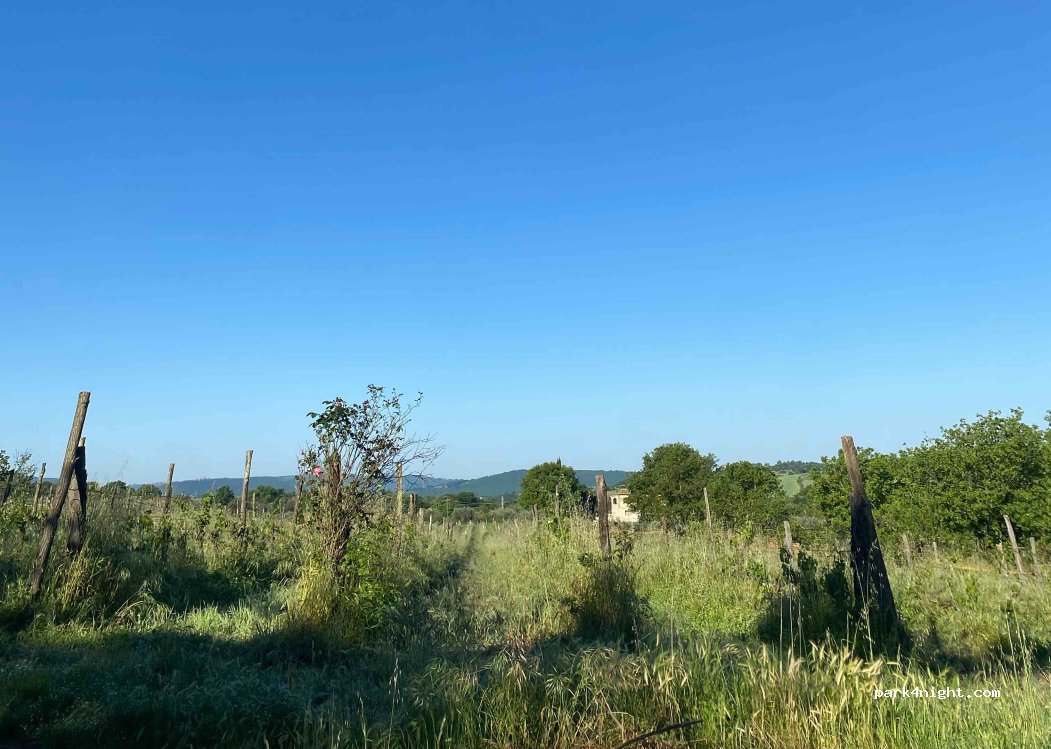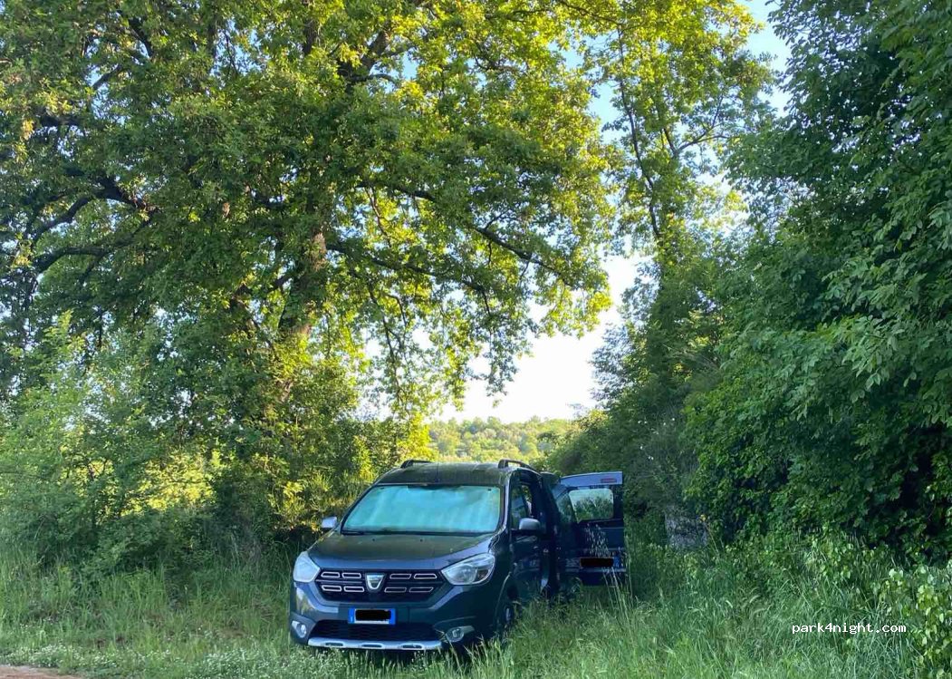 Small clearing between fields, very quiet place with trees that provide shade and beautiful view of the surrounding hills. Difficult road to get there, not suitable for campers or large vans.