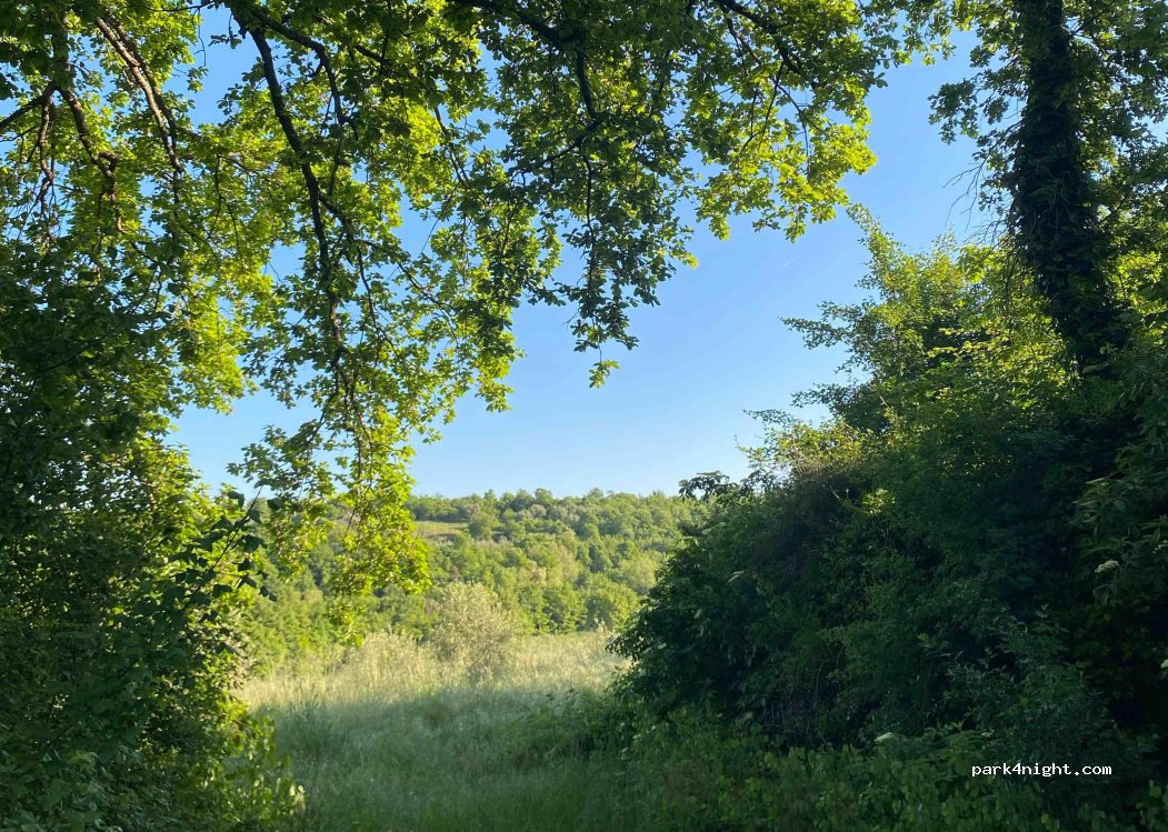 Petite clairière entre les champs, endroit très calme avec des arbres apportant de l'ombre et une belle vue sur les collines environnantes. Route difficile d'accès, non adaptée aux camping-cars ou aux grandes camionnettes.