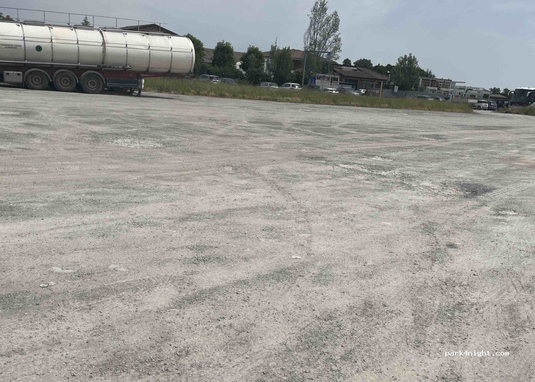 Parkplatz vor der Firma Bertinelli, wo man essen und die Molkerei besichtigen kann, außerdem gibt es eine Bar und einen tollen Laden, nachts etwas laut, weil die Straße daneben ist, aber sehr erträglich