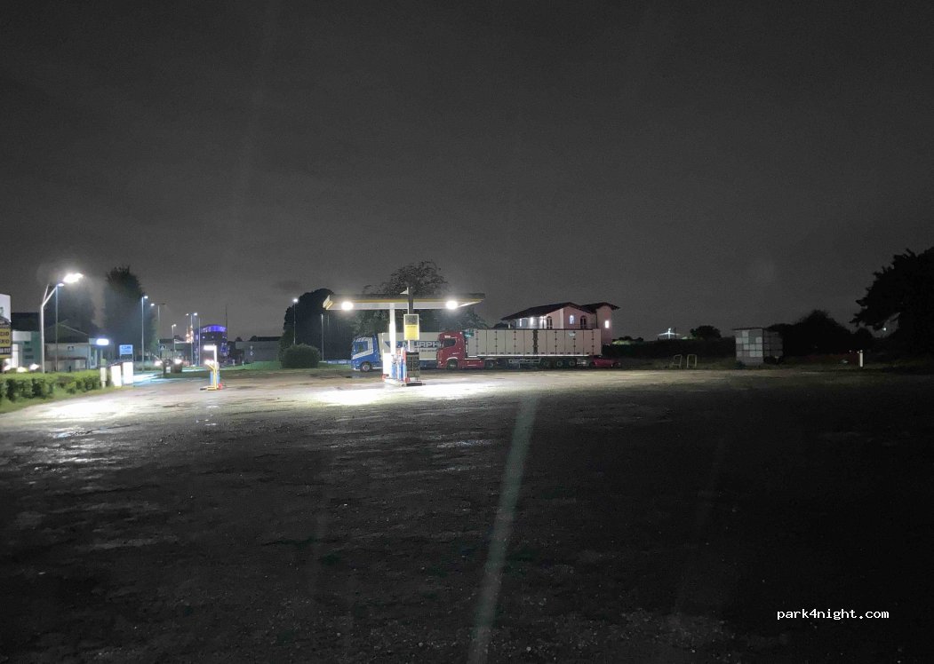 Großer Platz bei einer Tankstelle an einer Dorfdurchfahrtstrasse - auch LKWs parken hier. Bars in der Nähe