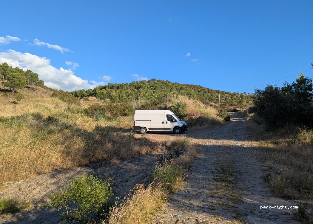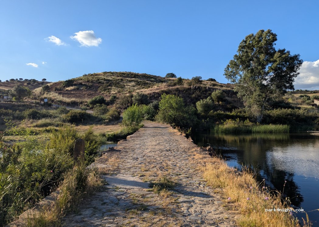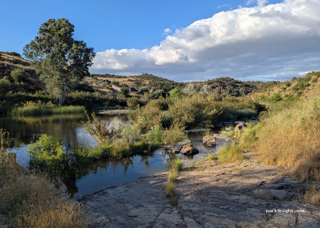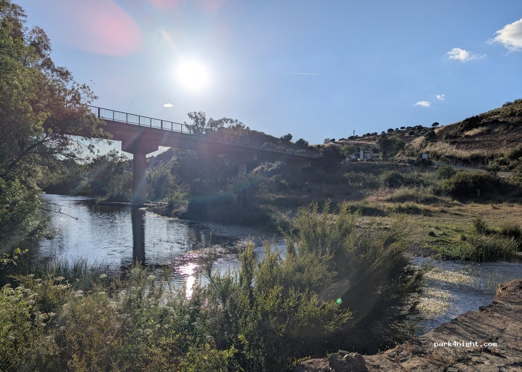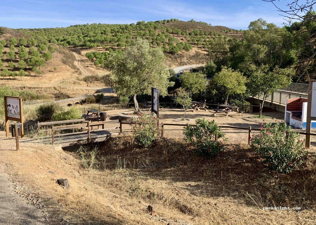 Picnic spot (4x + grill) with poor shadow by a stream named “Ribeira do Vascão” (dry up in late summer) - it is geographical limit of provinces Algarve <> Alentejo - on N side of very former bridge with hiking path PT8 MTL that starts from here (see info panel also in English) and birding trail. The ground is gravel but quite drivable, and there is only a couple of flat spots on S side; not illuminated.
