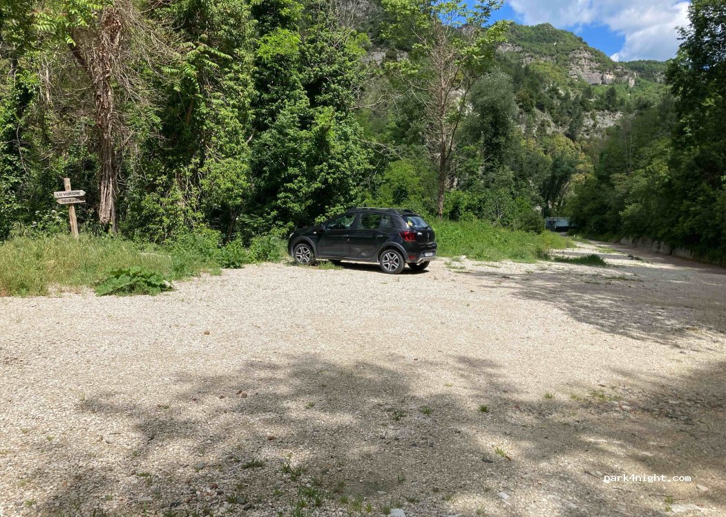 Le parking n’est plus possible à l’endroit indiqué mais en arrivant face aux thermes tourner à gauche et s’installer au bout du parking, très calme , chemins de balades aux alentours, accès à la piscine naturelle d’eau souffrée par une échelle en contrebas de l’hôtel. fond de vallée, pas de vue et le soleil passe vite mais reste un endroit agreable
