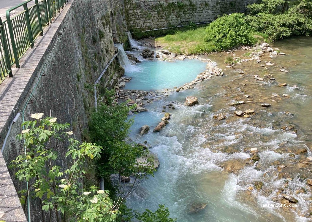Natación gratuita en agua tibia en el estacionamiento. Para aquellos que les gusta un poco de riesgo. Al final de una pequeña carretera municipal, aparcamiento sin restricciones. Baño en aguas termales sulfurosas y cascada. Acceso a pie 2 minutos no fácil (cruce del río a pie posible). Agua tibia 25-30 grados, piscinas equipadas. Curiosidad. Cueva de agua caliente. Tenga cuidado de continuar por el camino de acceso, no haga caso a la pequeña señal falsa de no entrada que hay en el césped del jardín. Es una carretera municipal habilitada para el tráfico y punto de partida de excursiones (estamos en Italia). Vueltas: se admiten furgonetas de hasta 6m.