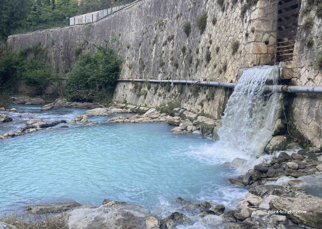 Free warm water swimming and parking. For those who like a bit of risk. At the end of a small municipal road, parking is not prohibited. Swimming in the sulfurous thermal waters and waterfall. Accessible on foot for 2 minutes, not easy (river crossing on foot is possible). Warm water (25-30 degrees Celsius), equipped pools. A curiosity. Hot water cave. Be careful to continue along the access road, ignoring the small, fake "no entry" sign that is there for the garden lawn. This is a municipal road authorized for traffic and a hiking trail (we are in Italy). Turns: vans up to 6m are OK.