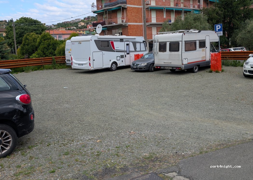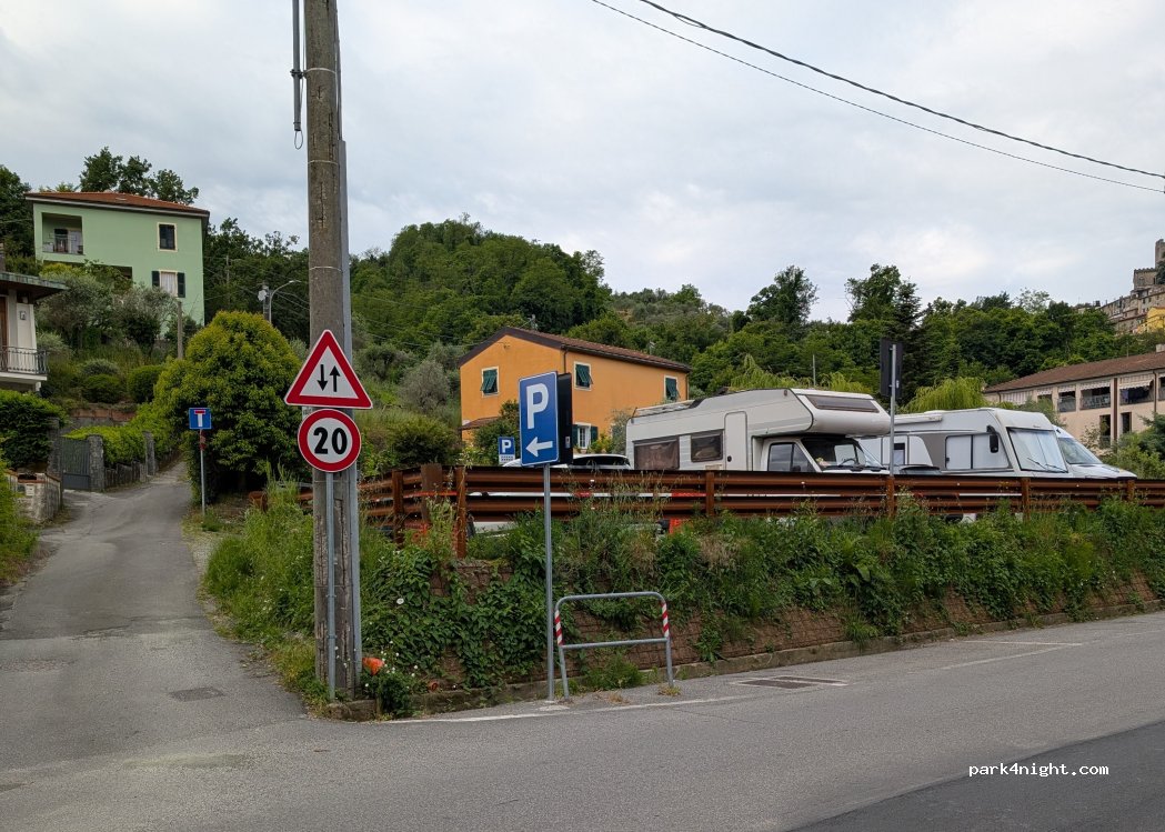Ampio parcheggio (anche di 7/7,5 m se non ci sono troppe auto parcheggiate), ottimo per dormire se si è di passaggio, strada poco trafficata di notte. A pochi passi si trovano un panificio (con un'ottima focaccia) e una delle migliori pasticcerie della zona.