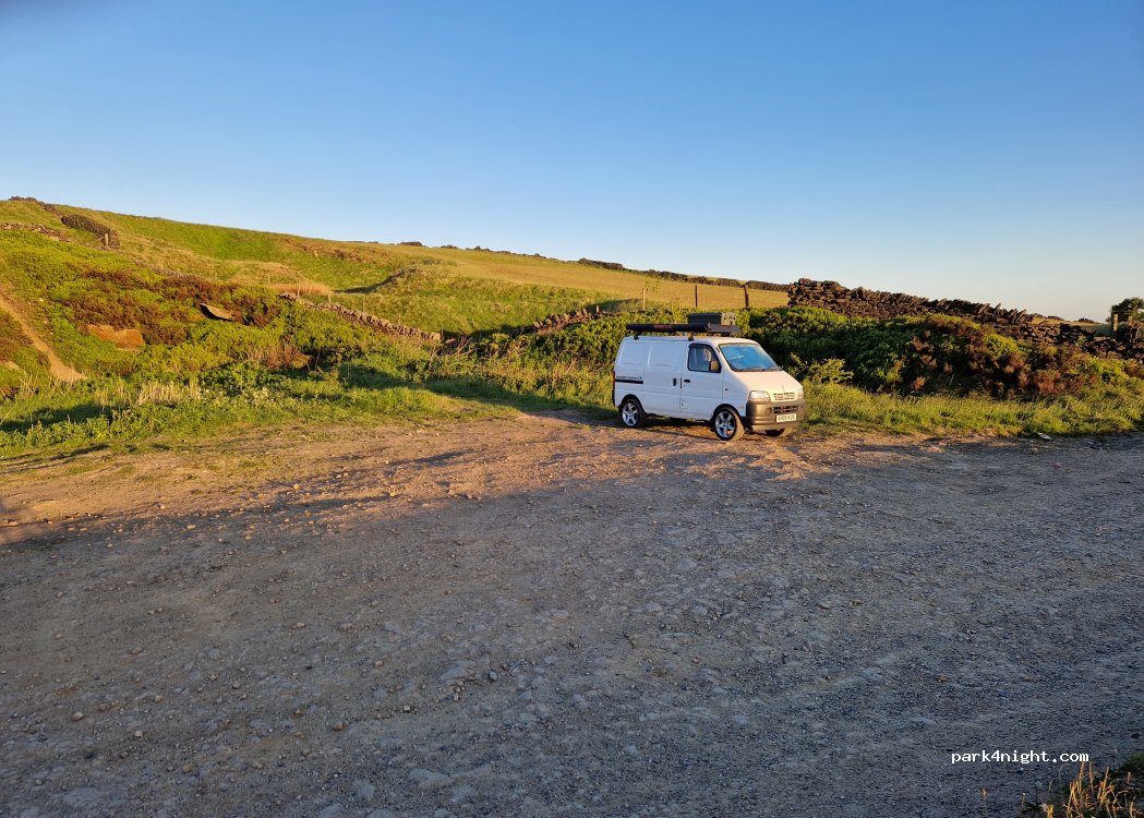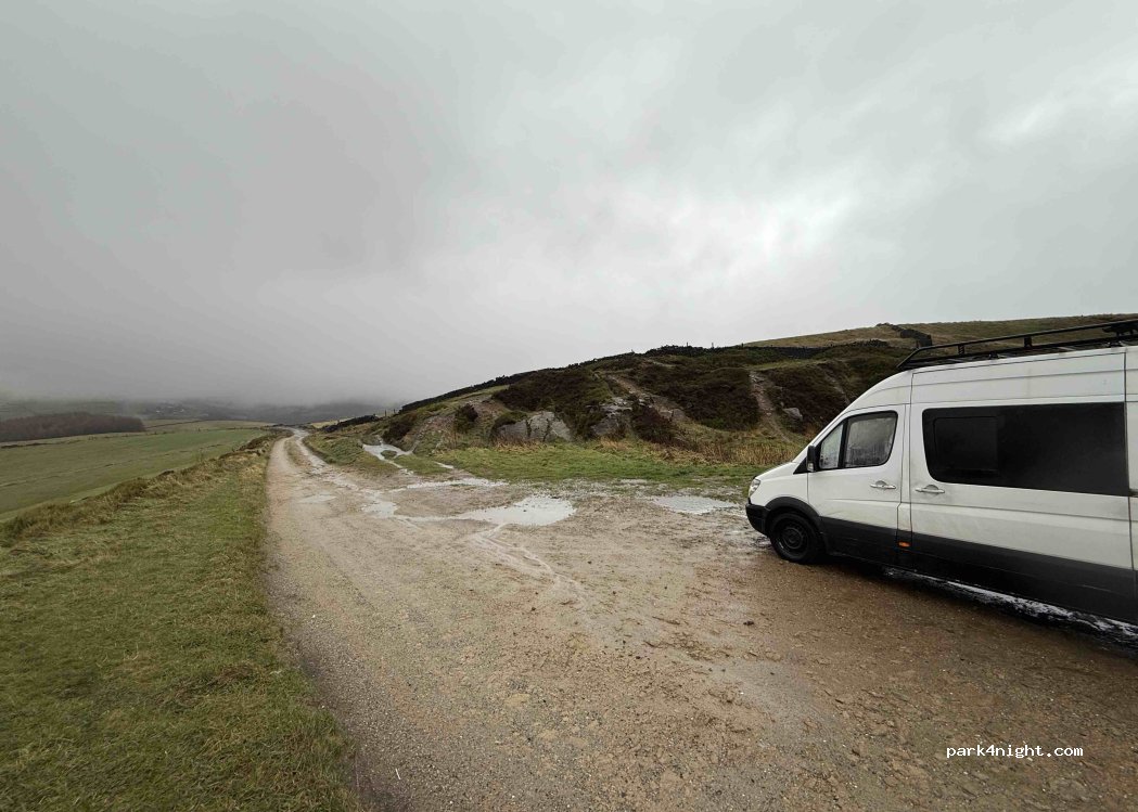 Great spot with a lovely view. Nice and quiet overnight on a Saturday into Sunday. Few bikers, walkers and runners came past in the morning, but no trouble. It was wet and windy, but we didn’t mind it at all. The access road is certainly full of large potholes but our LWB sprinter made it without issue. If you have a low slung motor home it might be a struggle.