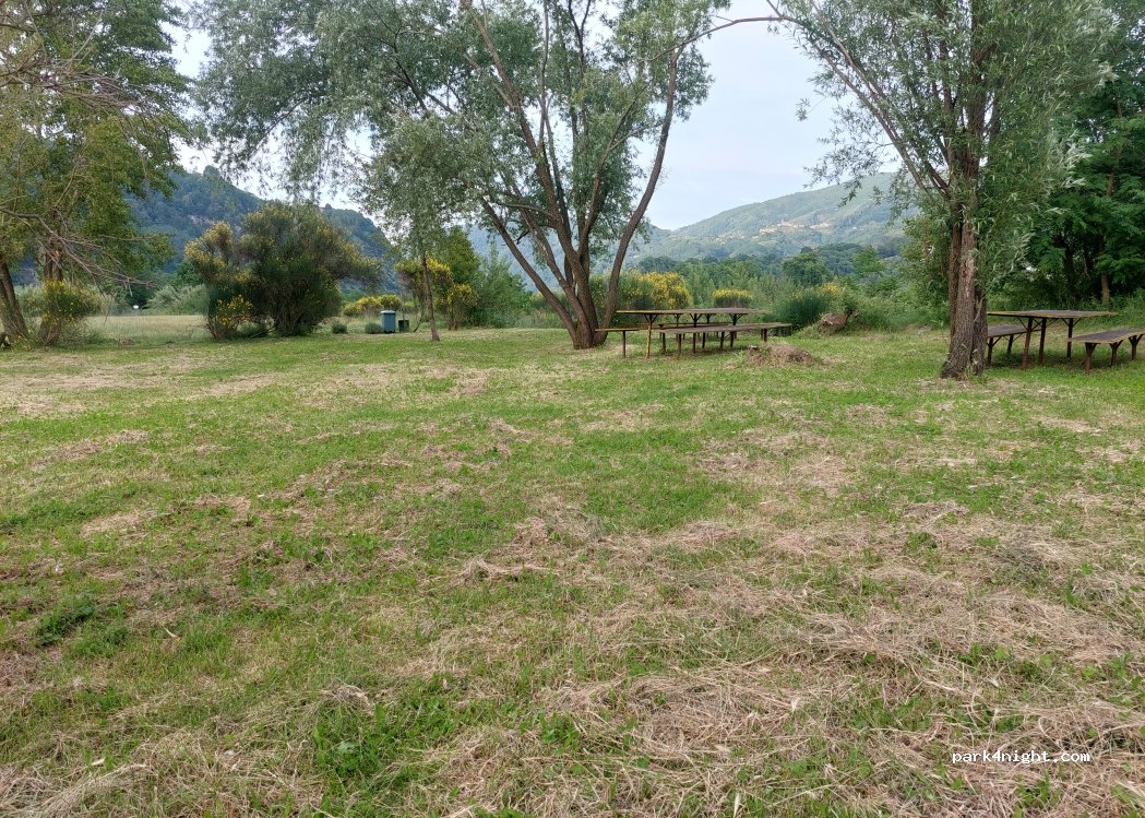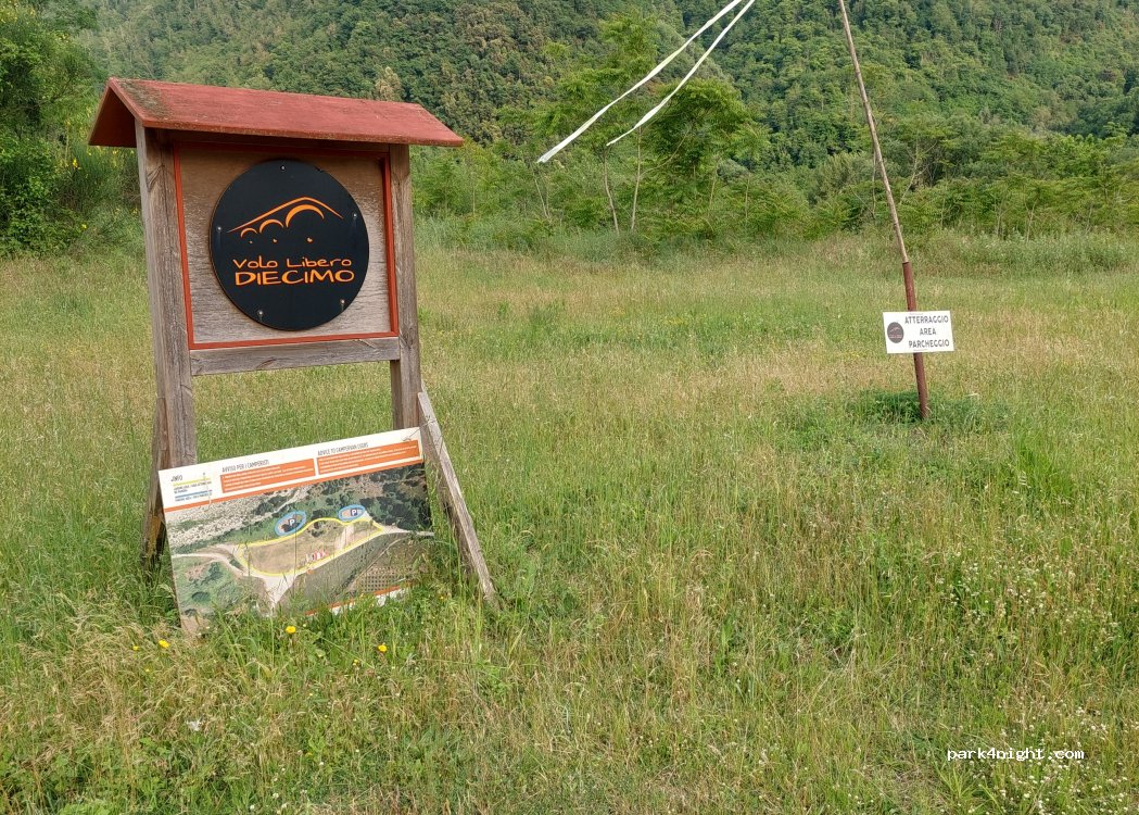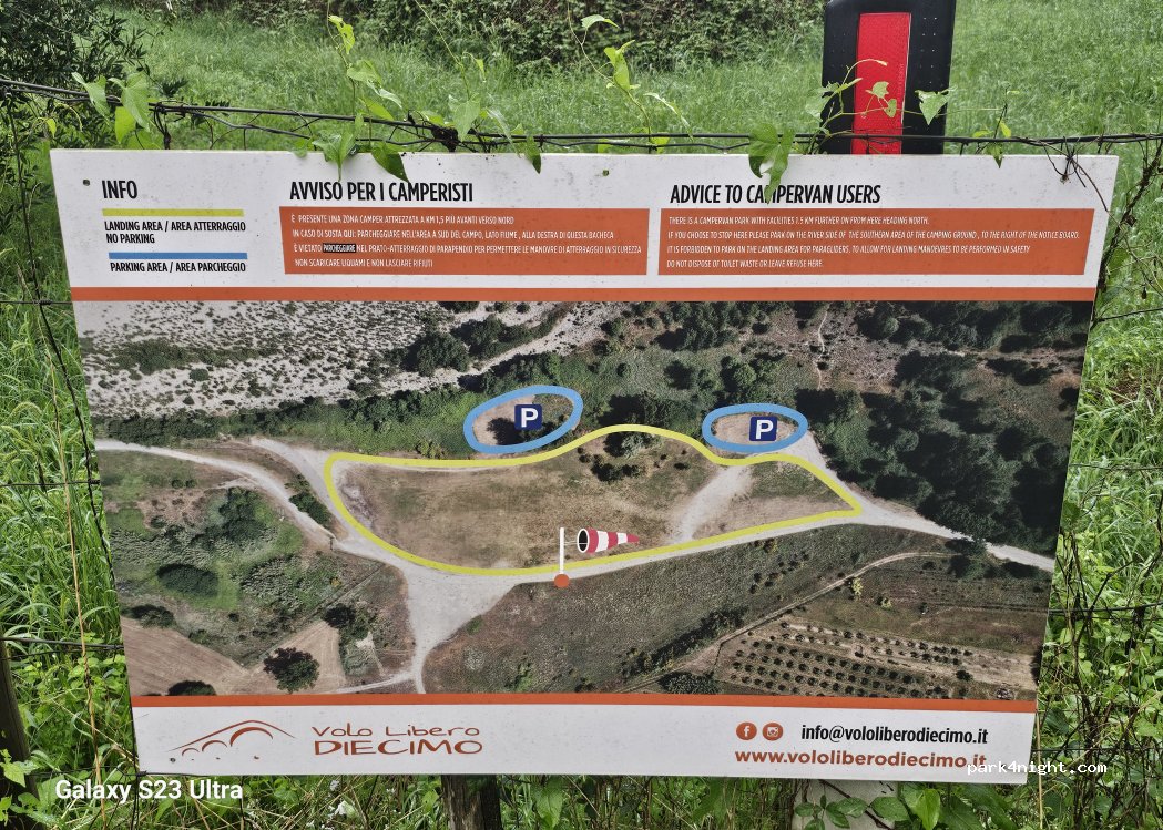 Area di atterraggio per parapendio. Con aree di parcheggio riservate per camper. L'intera area sembra un grande parco. Tranquillo di notte.