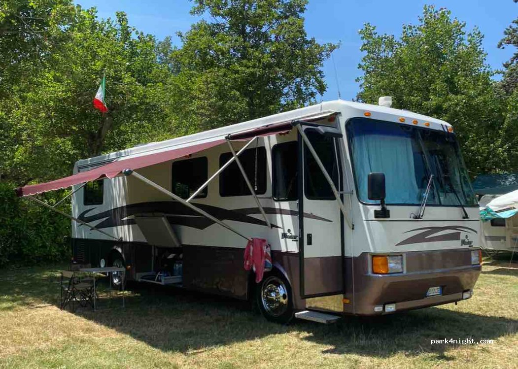 Camper parking area with electricity. Access for very large campers. Public services 300 meters away. Bus and train shuttle service to the city.