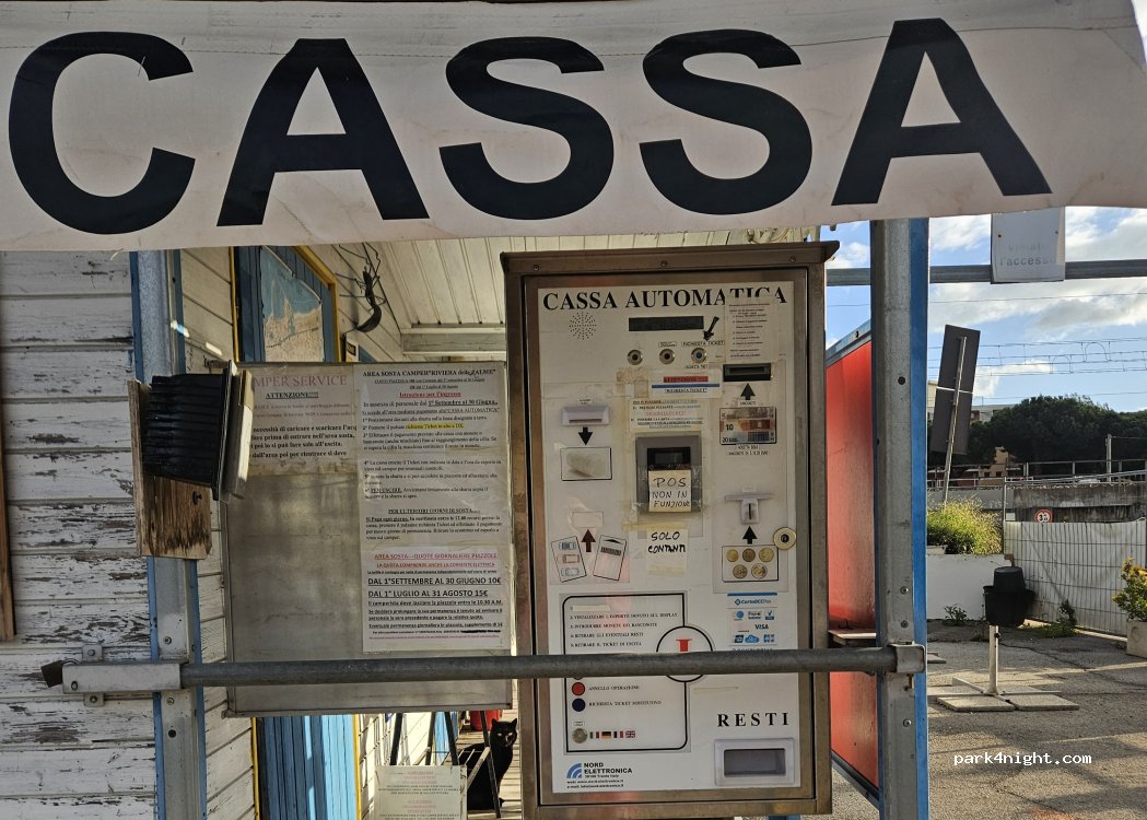 Area sosta attrezzata di tutto, CS, acqua potabile, docce calde 0,50 centesimi 1,5 minuti, lavello stoviglie con chiave, altrimenti fontanella 0,20 centesimi 12 litri circa. Piazzole abbastanza larghe su asfalto pianeggiante, l'unica pecca si trova sotto un cavalcavia e con la ferrovia alle spalle. C'è da dire che comunque fa ombra per qualche ora al giorno. Spiaggia a 300 metri con negozi.