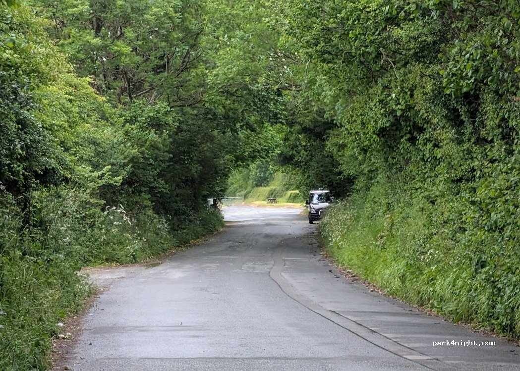 Lovely little dead end road. quiet night and trouble free. now and again you do here a car go by but not much given it's near a trunk road. mobile signal was poor but it was manageable. A lovely area to walk the dogs, beautiful church down the bottom. there is a truck stop cafe there aswell. NO BINS