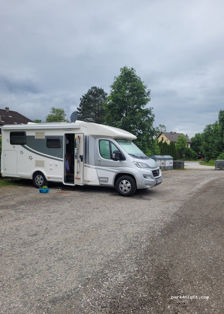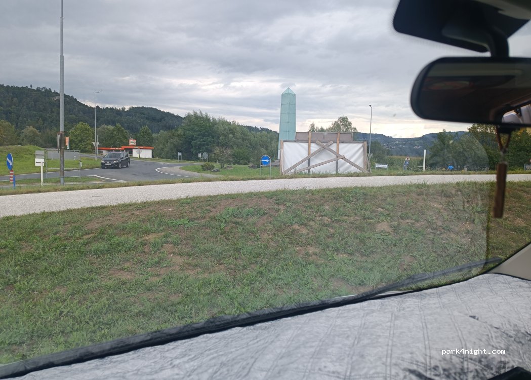 Auf dem Weg nach Slovenien hielten wir für eine Nacht auf diesem Parkplatz. Direkt neben einem Kreisverkehr aber in der Nacht nicht sehr viel Verkehr. Am morgen parkten ein paar andere Autos für ihre Tagesausflüge auf dem Parkplatz.