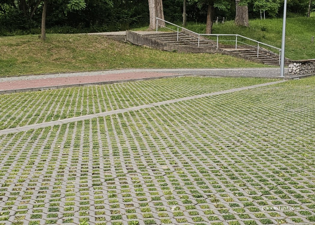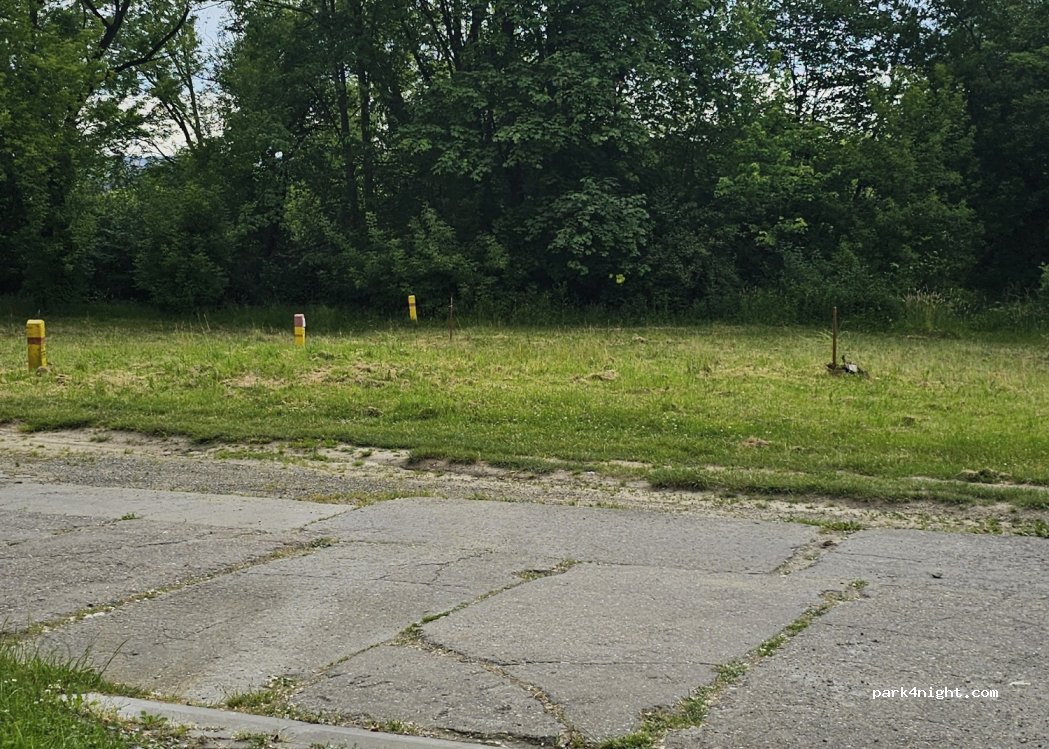 Ruhiger grasbewachsener Parkplatz mit Schatten neben dem öffentlichen Schwimmbad. Der Pool ist 10 Zloty pro Person inklusive Dusche, Toilette usw. Ruhige Straße mit gutem Telefonsignal